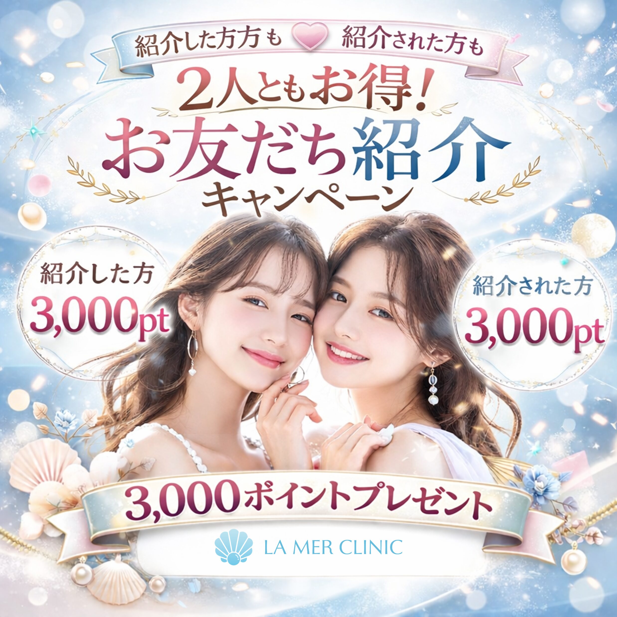 「友達に紹介したい美容クリニックを探している」「お得に施術を受けたい」 そんな方におすすめなのが、ラメールクリニックのお友だち紹介制度です。紹介した方も、紹介された方も、どちらも3,000円分のポイントがもら...