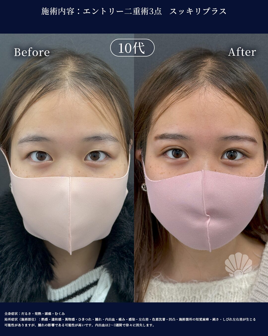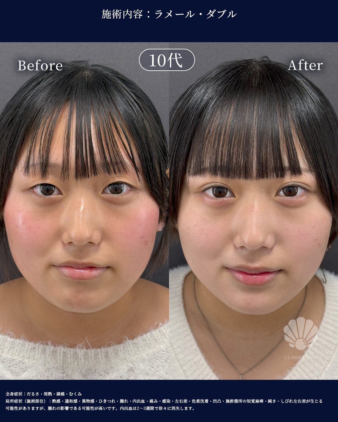 腫れ、内出血、傷跡、左右差、感染などの可能性があります。