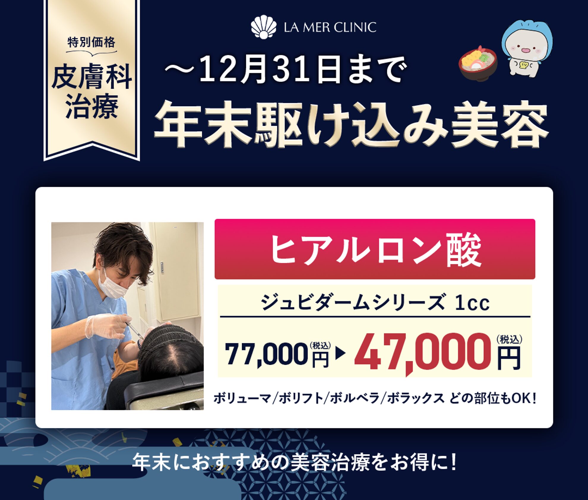 「今年の悩みは、今年のうちに。」年末の限られた期間だからこそ受けたい、ダウンタイムを抑えた医療ヒアルロン酸注入。 ラメールクリニックでは厚生労働省承認のヒアルロン酸《ジュビダームシリーズ》を使用した年末限定の...