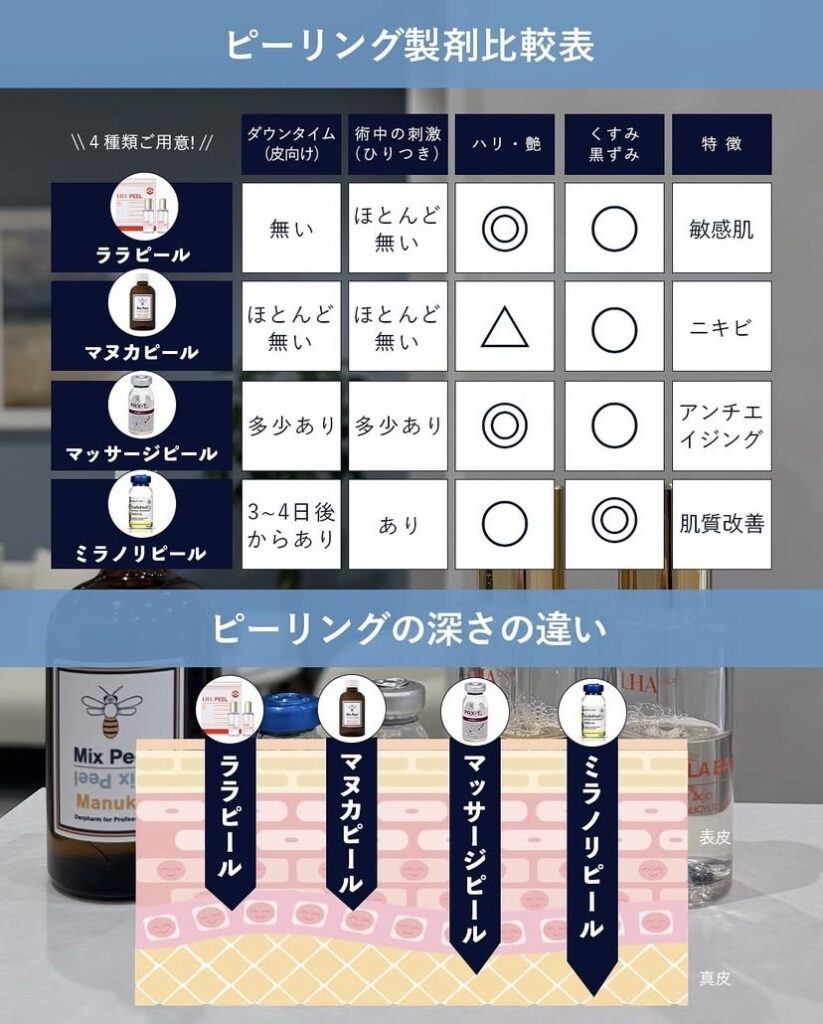 ラメールクリニックでは、全部で4種類のピーリング製剤を取り扱っています!