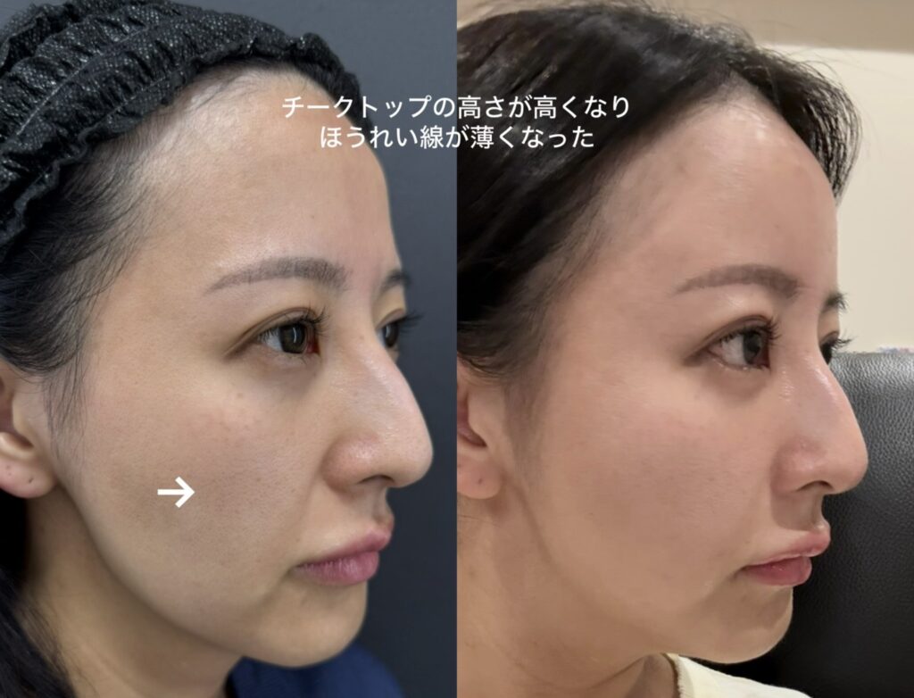 チークトップが高くなり横顔や斜めでも自然にふっくら見えること。