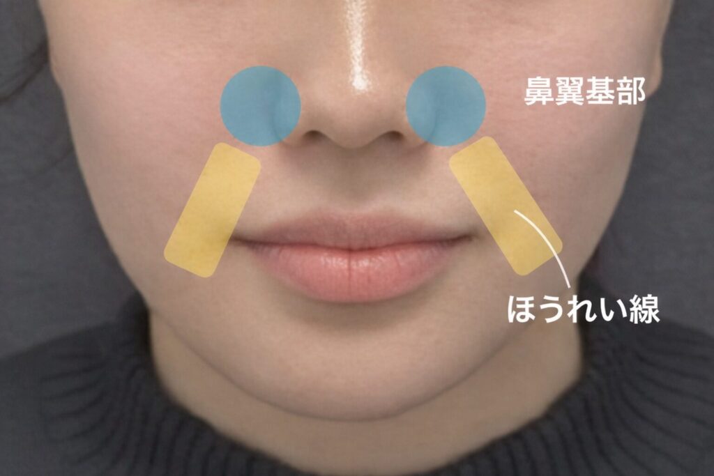 鼻翼基部とは、小鼻の付け根〜ほうれい線の始まり部分のこと。