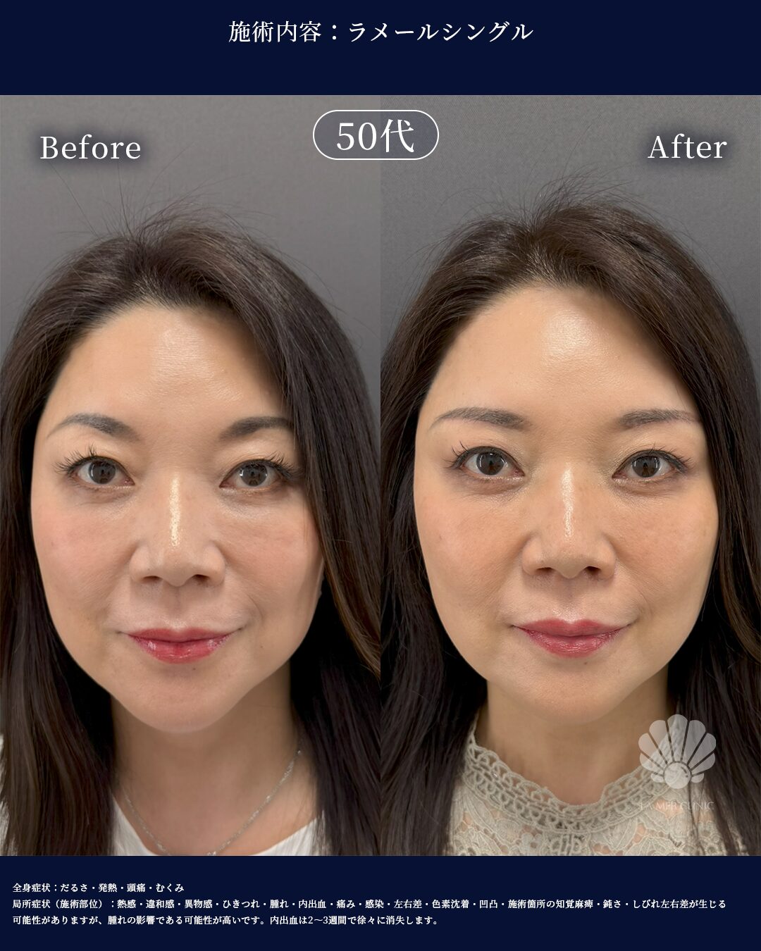 - 糸リフトの併用により、フェイスラインもすっきりと引き締まり、総合的な若返り効果を得られました