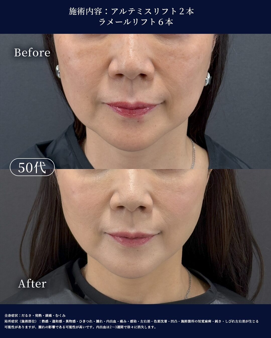 その後、たるみに合わせて糸リフトをバランス良く配置することで、自然な表情を保ちながらすっきりとした輪郭へ。