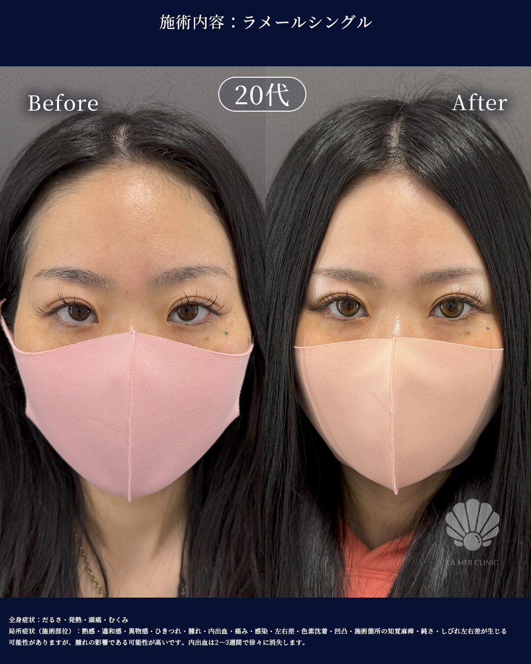 腫れ、内出血、左右差、感染、血腫、傷跡の赤み・盛り上がり、瘢痕、後戻り、つっぱり感、希望の仕上がりとの差など