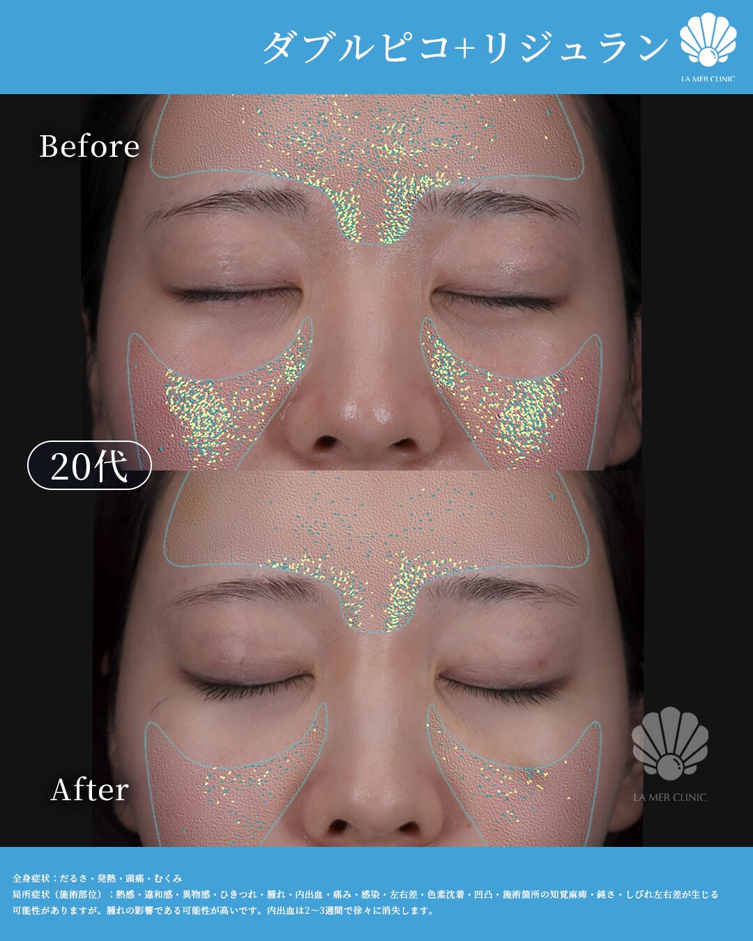 → ピコレーザーは微細な赤み、リジュランは注射部位の小さなふくらみ(数日)が出ることがあります。