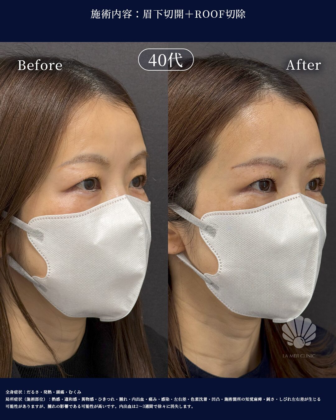 眉下切開でまぶたの重さを改善|右目のみROOF切除を併用した症例(49歳女性)|名古屋ラメールクリニック眉下切開でまぶたの重さ・厚みを改善した49歳女性の症例をご紹介します。右目のみROOF切除を併用し、左右差と腫れぼったさを改善しています。ダウンタイムやリスクについても解説します。