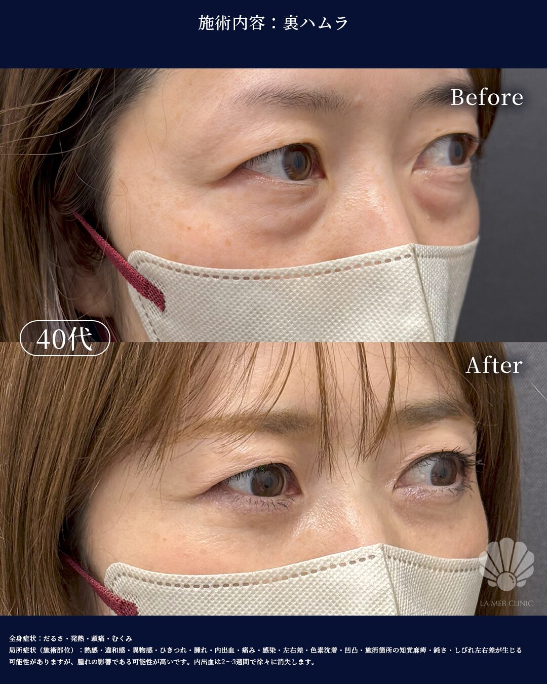 目の下のクマ・たるみを改善する裏ハムラ法|初めてのクマ治療症例(44歳女性)90日後目の下の膨らみ・クマでお悩みの方へ