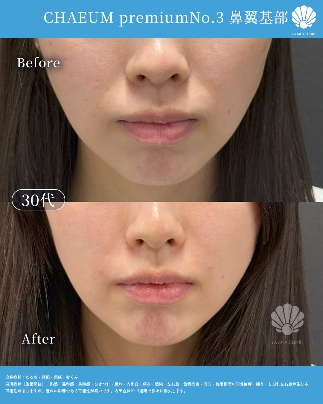 【名古屋】鼻翼基部ヒアルロン酸でほうれい線を自然に改善|CHAEUM premium No.3(30歳女性・初回)施術概要
