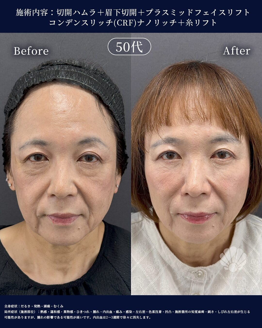 【50代女性】眉下切開+切開ハムラ+ミッドフェイスリフト+脂肪注入|目元と中顔面を同時に若返らせた症例