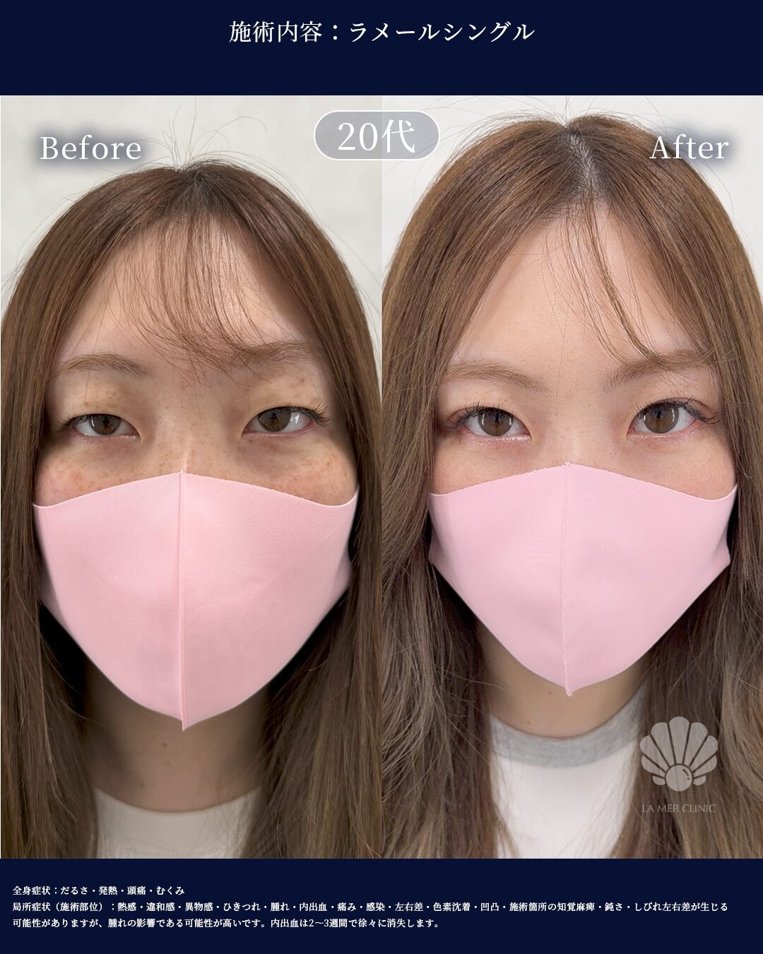 局所症状(目元・施術部位): 熱感・違和感・ゴロゴロ感・腫れ・内出血・痛み・感染・二重幅の左右差・ラインの乱れ・目の違和感・蕁麻疹・痒み・色素沈着・傷跡の盛り上がり・凹み・施術箇所の知覚麻痺・鈍さ・しびれ・タルミの残存を感じる
