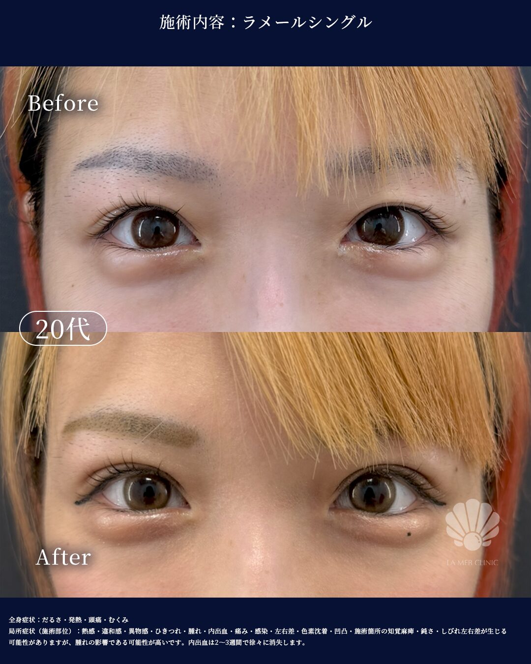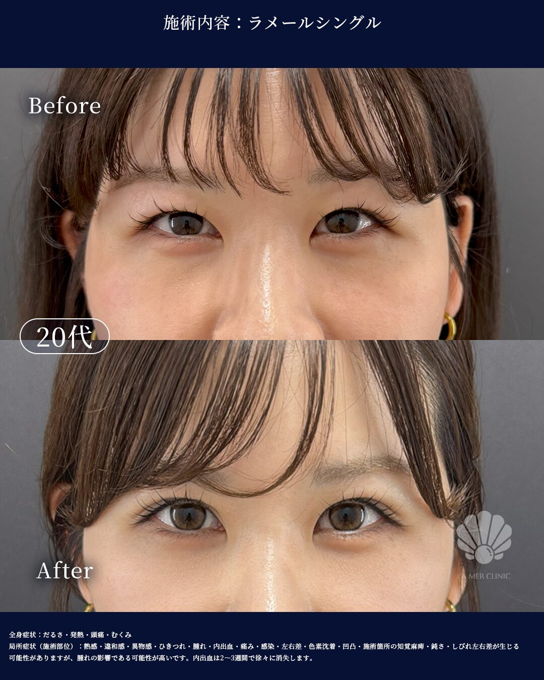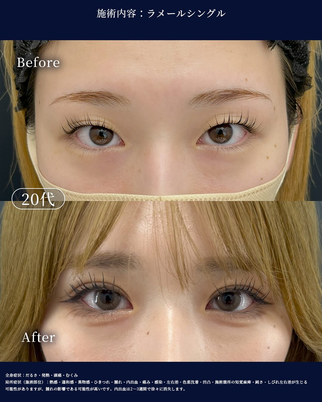 局所症状(目元・施術部位): 熱感・違和感・ゴロゴロ感・腫れ・内出血・痛み・感染・二重幅の左右差・ラインの乱れ・目の違和感