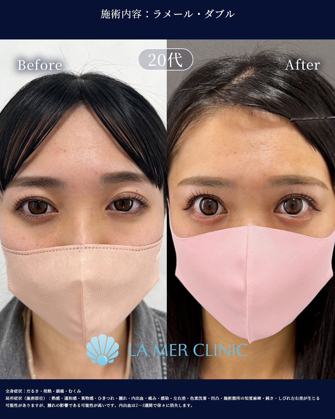 術後の腫れにより、一時的にまぶたが開きにくく、二重幅が広く見えることがあります。