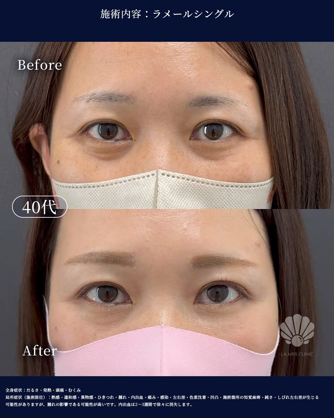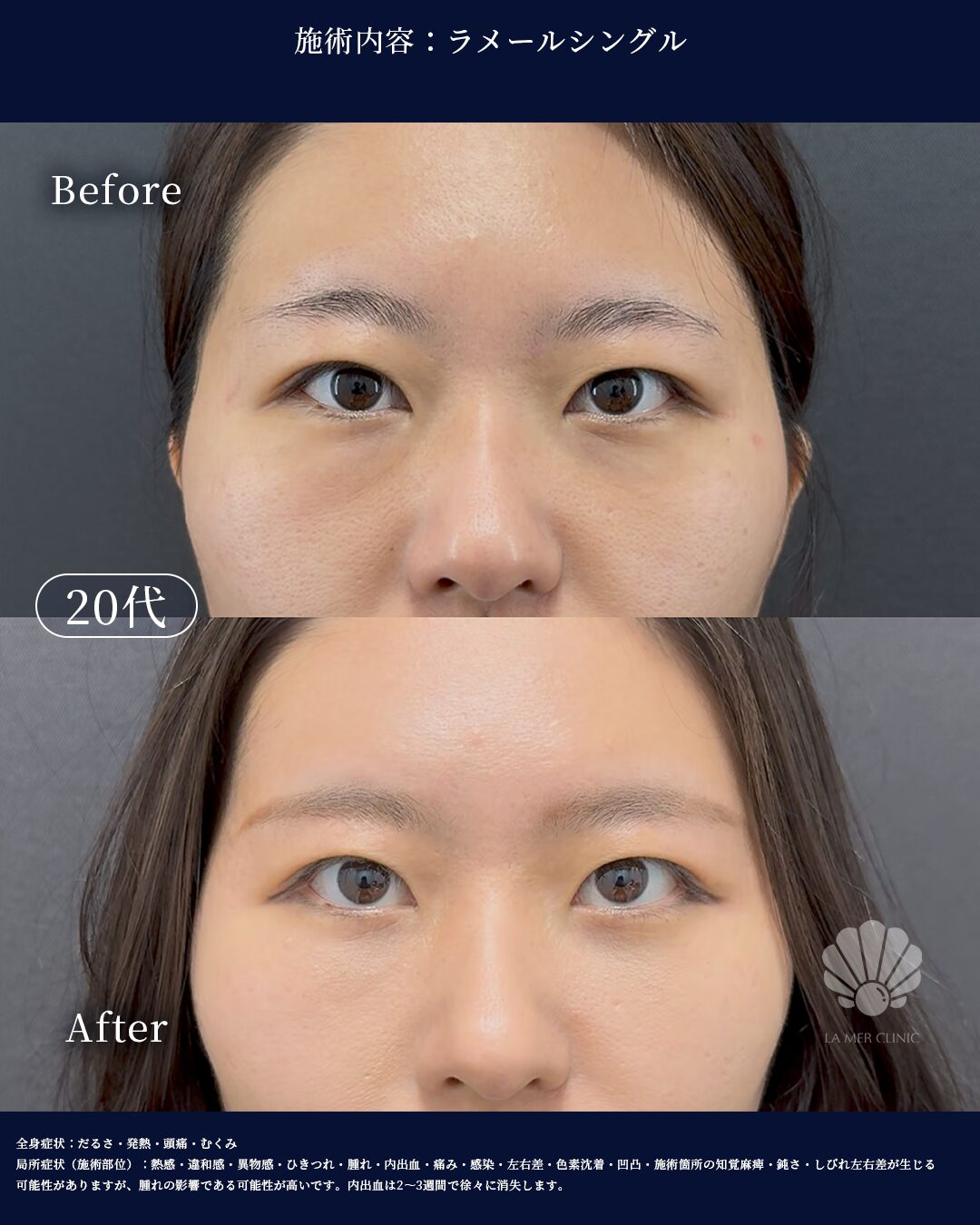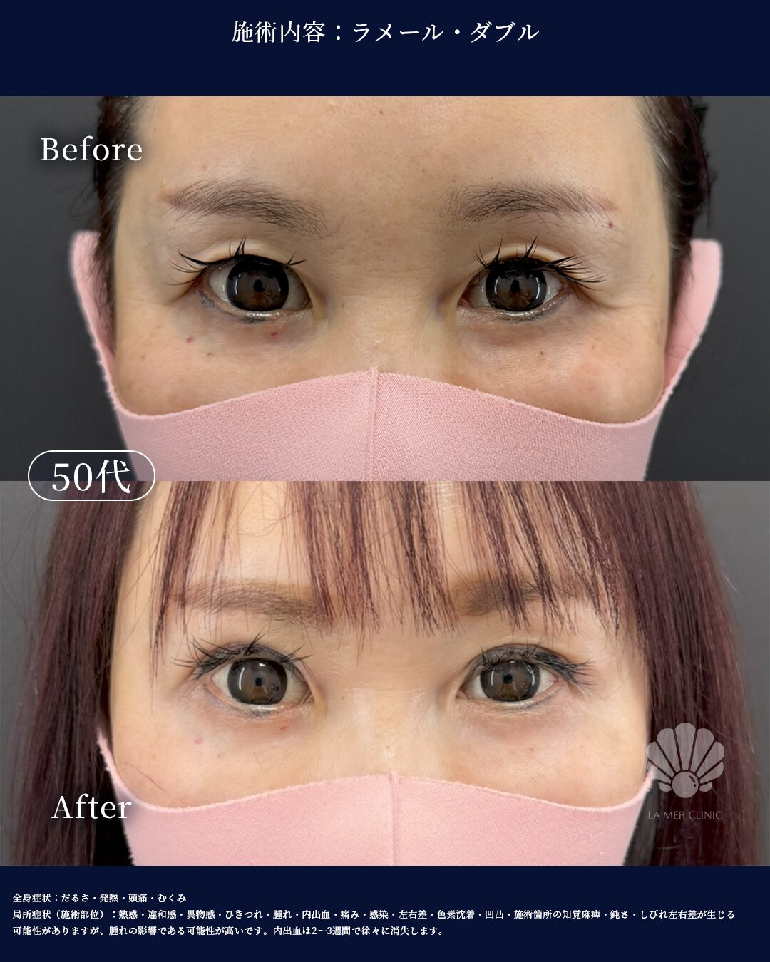 局所症状(目元・施術部位): 熱感・違和感・ゴロゴロ感・腫れ・内出血・痛み・感染・二重幅の左右差・ラインの乱れ・目の違和感- 副作用・リスク