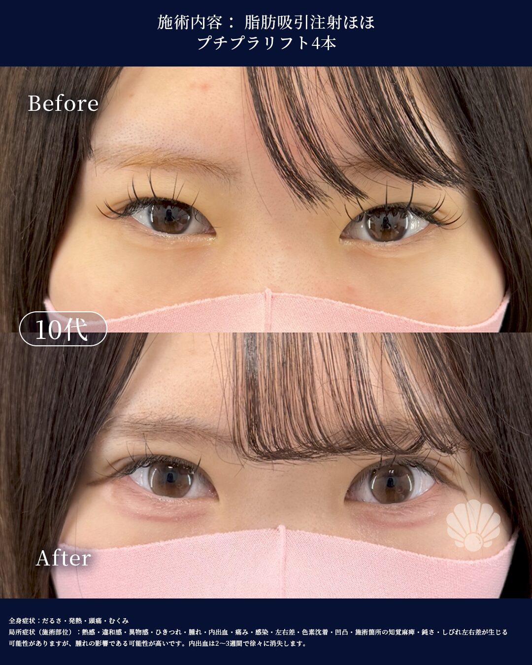 局所症状(目元・施術部位): 熱感・違和感・ゴロゴロ感・腫れ・内出血・痛み・感染・二重幅の左右差・ラインの乱れ・目の違和感- 副作用・リスク