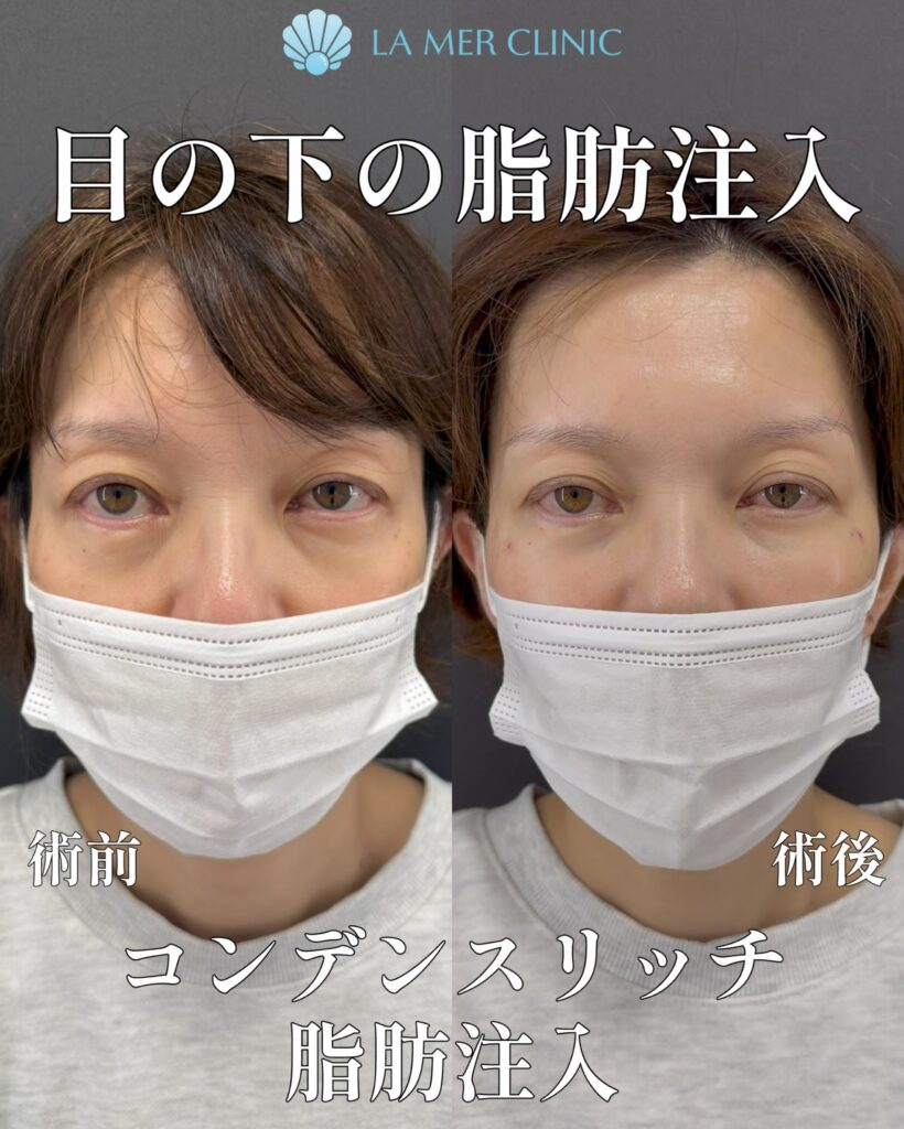 太ももやお腹から採取した脂肪を、目の下へ注入する施術。