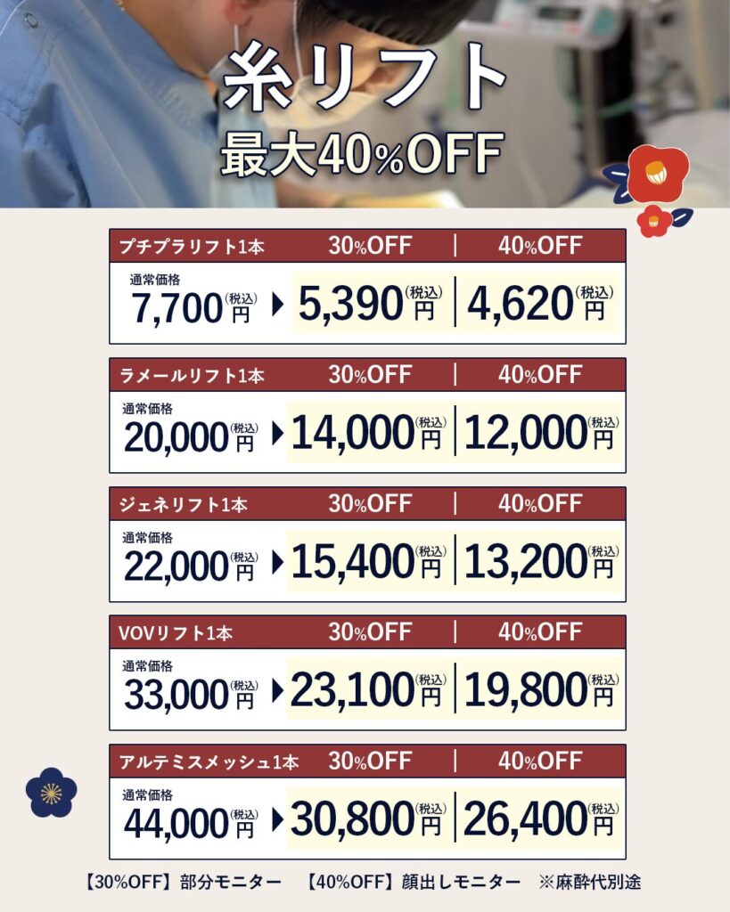1月のお年玉キャンペーンでは、糸リフト1本4620円(税込)〜お試しいただくことができます。