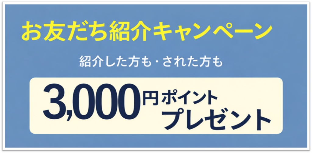紹介した方も、紹介された方も、どちらも3,000円分のポイントがもらえるお得な特典をご用意しています。