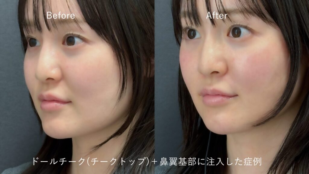 ドールチーク・チークトップのヒアルロン酸注入は、頬の丸みと高さを出すことで顔全体のバランスを整える人気のある注入部位です。