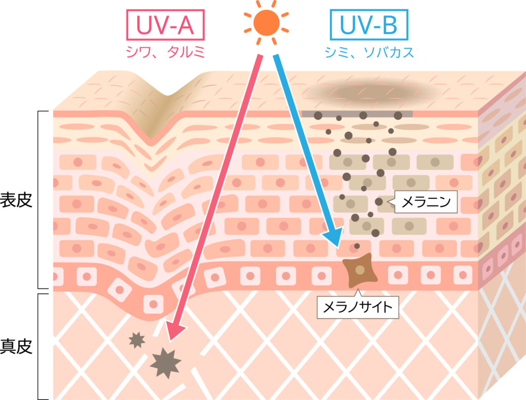 • UVB(B波): いわゆる「焼ける紫外線」。エネルギーが強く、肌表面に炎症を起こし、シミ・そばかすの原因になります。