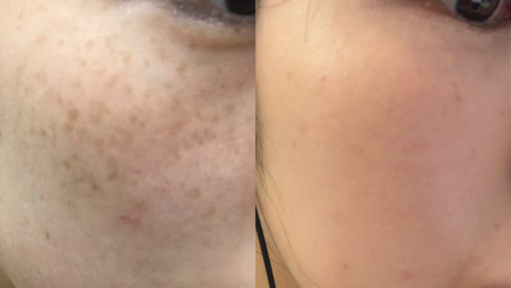 お顔全体のトーンが上がり、長年悩んだシミ・そばかすがほぼ目立たなくなっています。