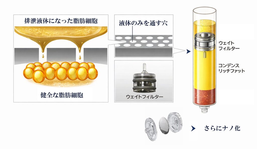 不自然な仕上がり になってしまうことがあります。しかし、ナノリッチでは 脂肪細胞を超微細なサイズに加工することで、