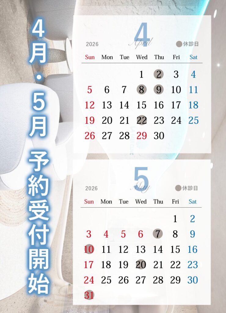 ゴールデンウィーク期間【4月29日〜5月6日】は混雑が予想されます。ゴールデンウィークに施術をご検討されている方は、事前にカウンセリングへお越しいただくことをおすすめしております。
