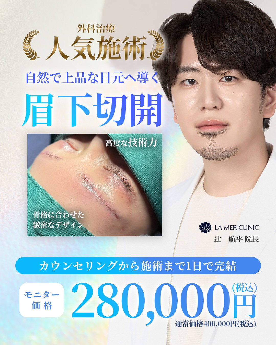 「眉下切開って、傷が残りませんか?」 眉下切開をご検討される方から、最も多いご質問が「傷跡」についてです。 ・本当に消えるの?・眉毛の下に線が残らない?・すっぴんでも大丈夫? このページでは、眉下...